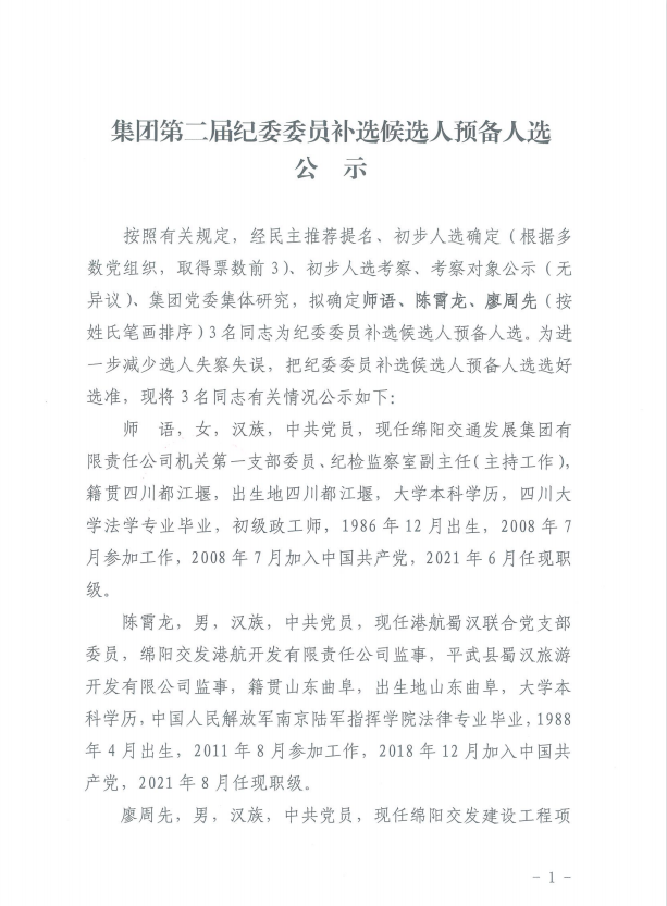 中拱綿陽(yáng)交通發(fā)展集團(tuán)有限責(zé)任公司委員會(huì)<關(guān)于進(jìn)行集團(tuán)第二屆紀(jì)委委員補(bǔ)選候選人預(yù)備人選公示的通知>